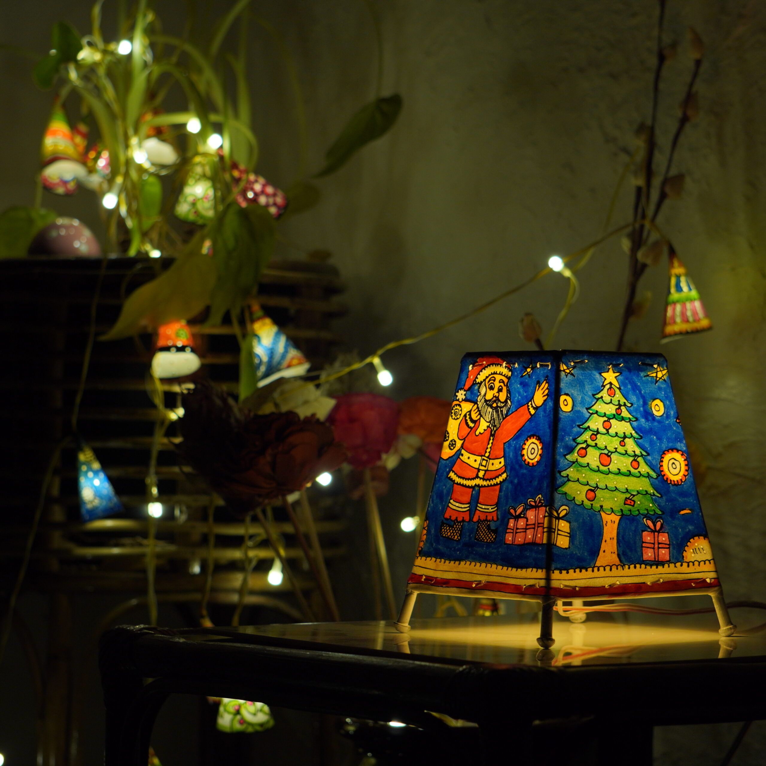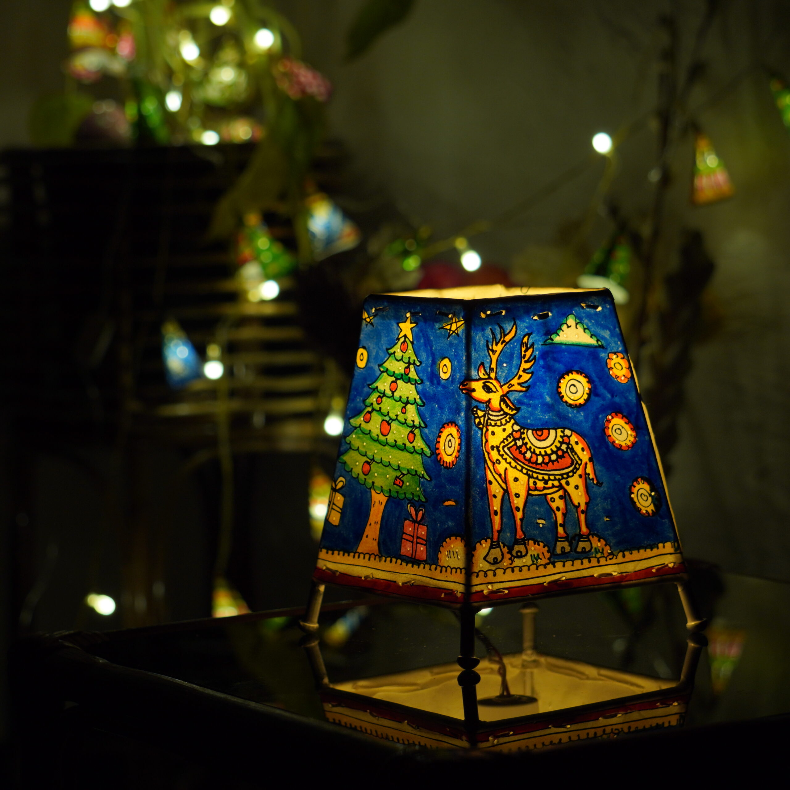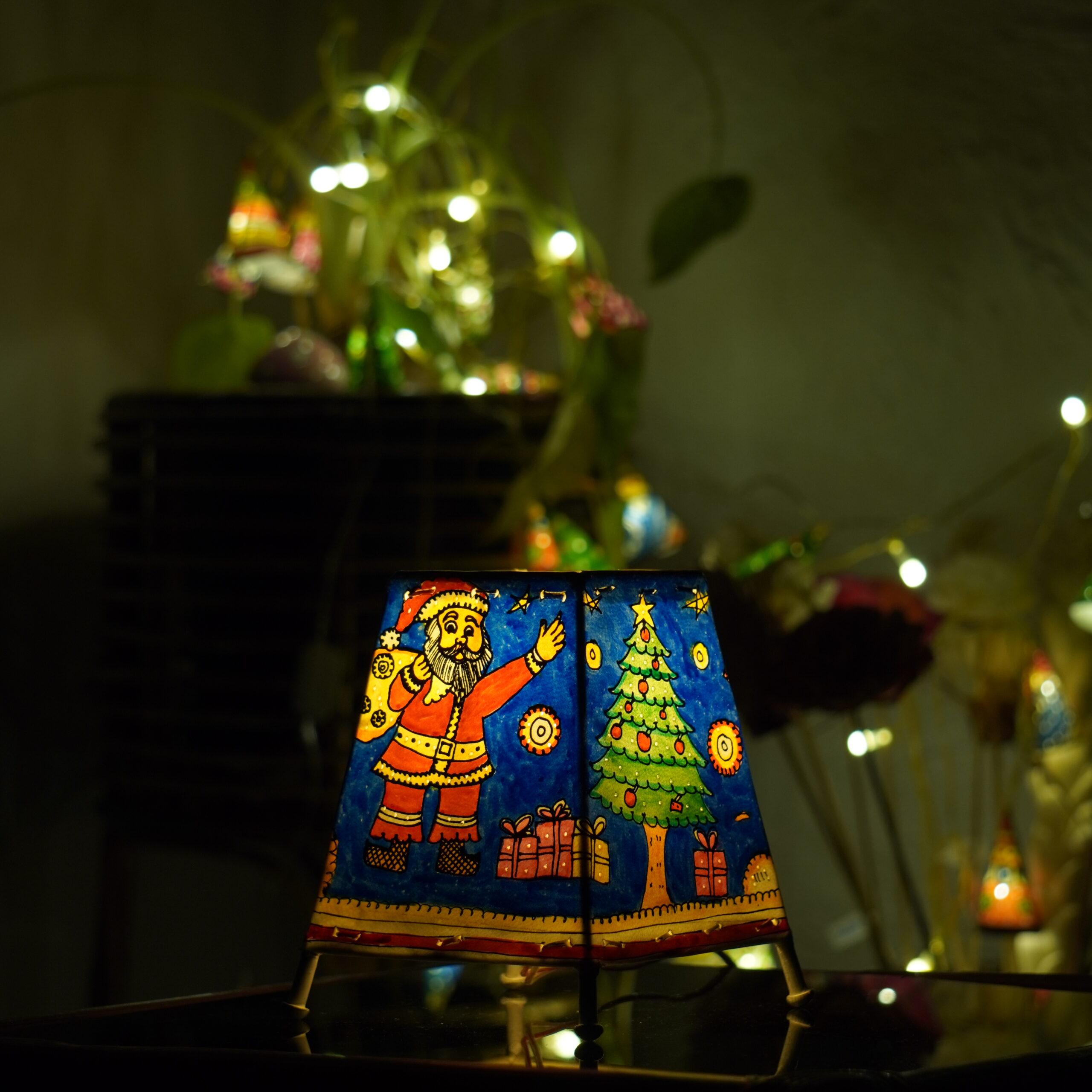 6 -inch hand-painted leather Christmas lamp with festive holiday designs and iron framework. A perfect blend of seasonal art and warm lighting for unique holiday home décor.