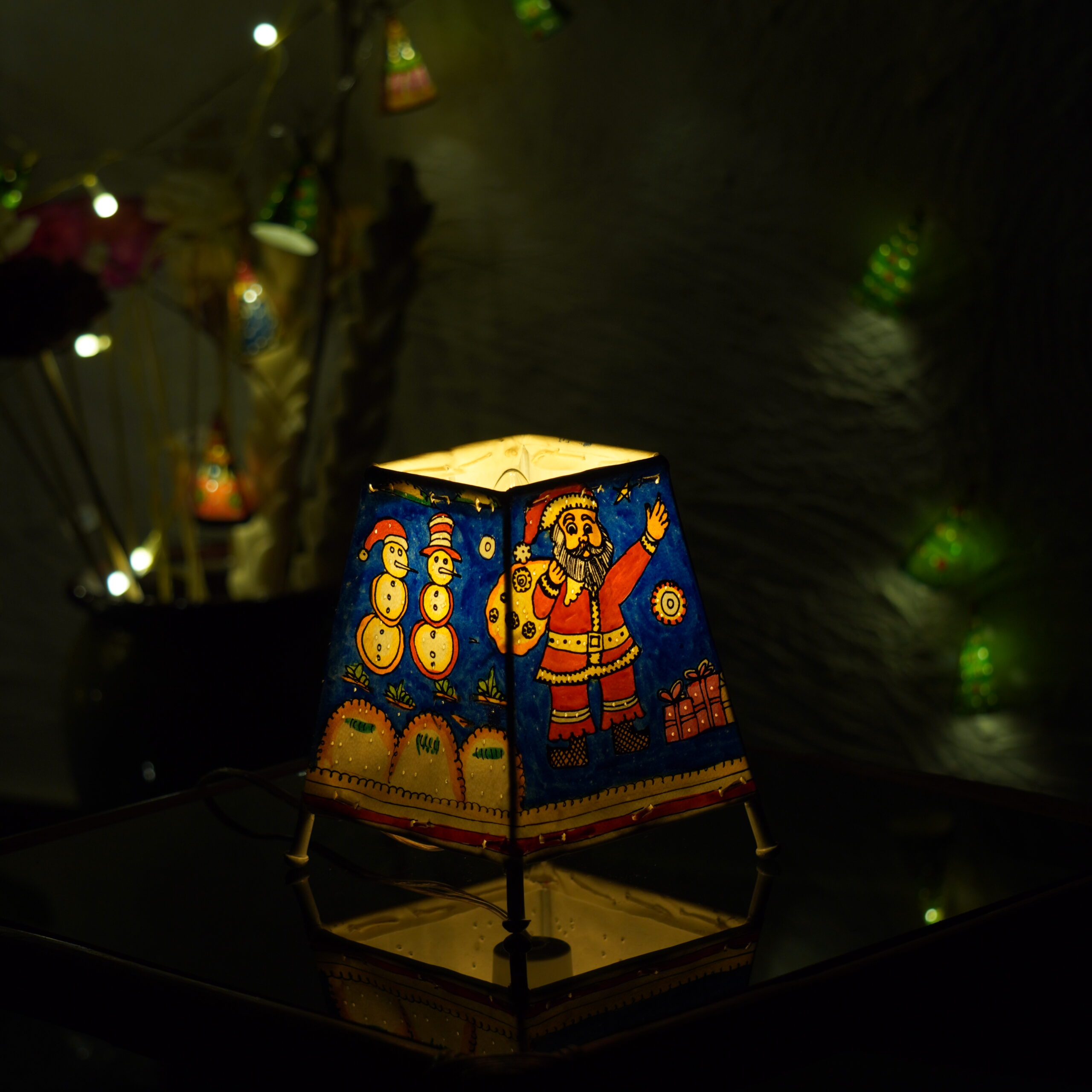 Brighten your holiday season with this 6-inch handcrafted leather Christmas lamp, featuring a festive and vibrant seasonal design. Each lamp is meticulously hand-painted by skilled artisans, blending traditional leather craft with the timeless charm of holiday motifs.