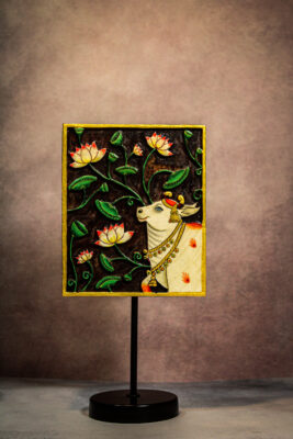 This Divine Cow & Lotus Wooden Carving beautifully blends spirituality with craftsmanship. The artwork depicts a sacred cow, adorned with traditional ornaments, amidst blooming lotus flowers symbolizing purity and prosperity. Intricately hand-painted in vibrant shades, the carving reflects traditional Indian artistry. Mounted on a sleek stand, it effortlessly enhances living spaces, meditation corners, or offices. An elegant choice for those who value heritage-inspired decor or seek a meaningful gift.